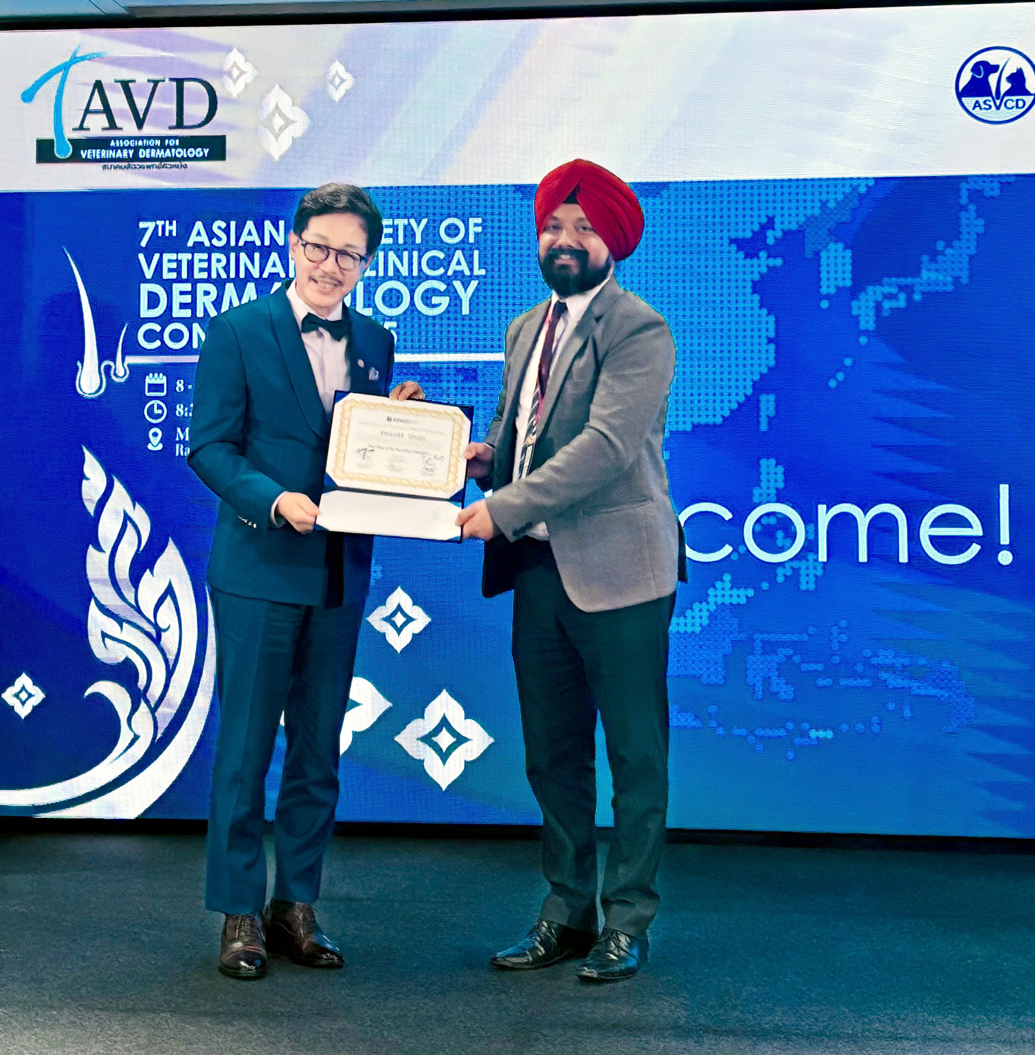 (Diplomate) by the Asian Society of Veterinary Clinical Dermatology (ASVCD) during its Seventh Continental Conference held in Bangkok, Thailand. This distinguished credential recognizes exceptional clinical acumen, sustained scholarly contribution and demonstrated leadership in the rapidly evolving discipline of comparative and companion animal dermatology, alongside his recognized expertise in veterinary hemodialysis and extracorporeal therapies, which significantly broaden his translational clinical profile. The conference, attended by eminent dermatologists and clinician-scientists from several nations. Dr. Singh was also nominated as the Vice-President of ASVCD-India during the executive council meeting.