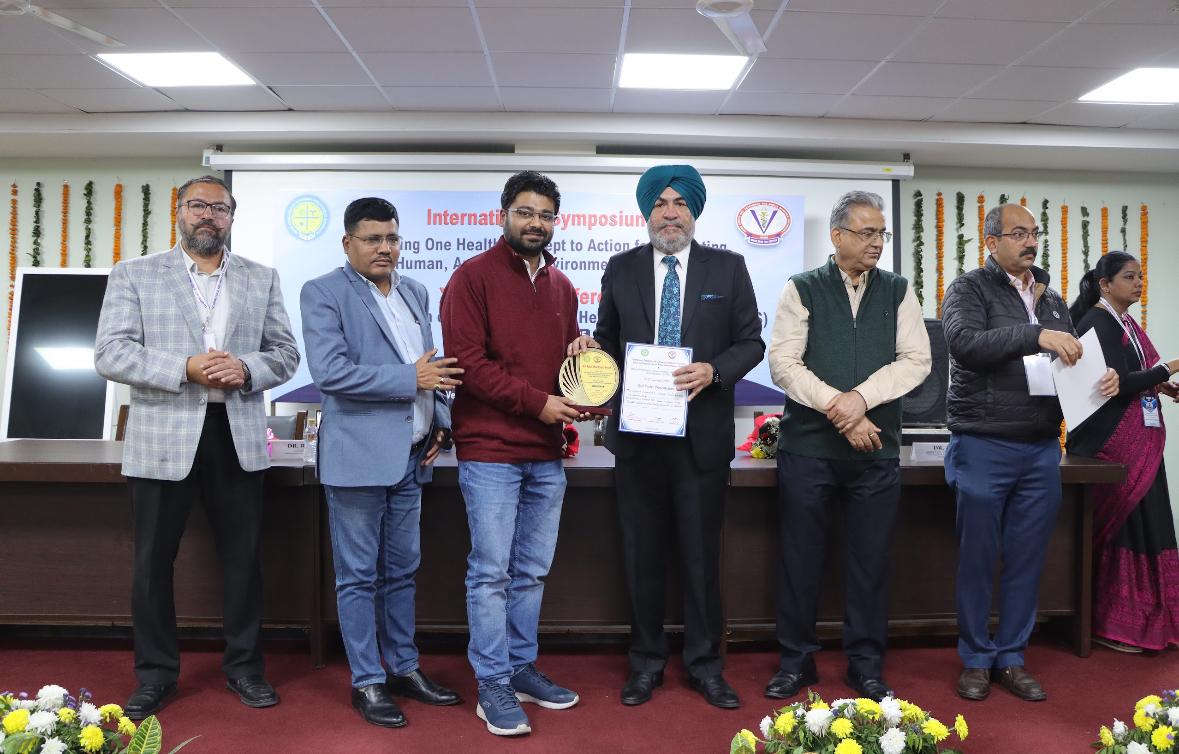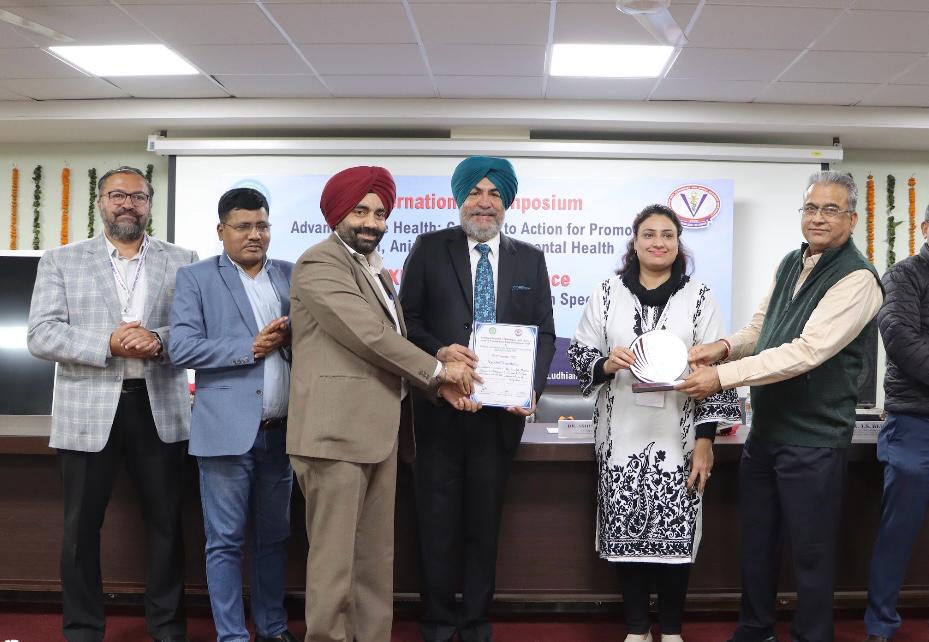 Faculty members of Animal Disease Research Centre, Vet Varsity achieved notable success at recently held IAVPHS-2025 conference, securing one Best Oral and three Best Poster Presentation awards. Dr. Vishal Mahajan, Dr. Prateek Jindal, Ms. Apoorva, Ph.D. scholar were honored with Best Poster Awards, while Dr. M.S. Bal and Dr. Alveena Gnai won the Best Oral Presentation Award. The department's scientists presented first report from Punjab on molecular detection of Anaplasma platys in dogs and also emphasized need for regular anthelmintic treatments, potentially integrated with rabies vaccination, to prevent zoonotic helminthic infections from stray dogs.