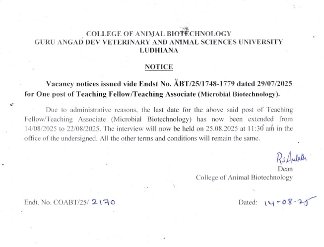 Vacancy Notice issue vide Endst. No. ABT/25/1748-1779 dated 29/07/2025 for one post of Teaching Fellow/Teaching Associate (Microbial Biotechnology)
