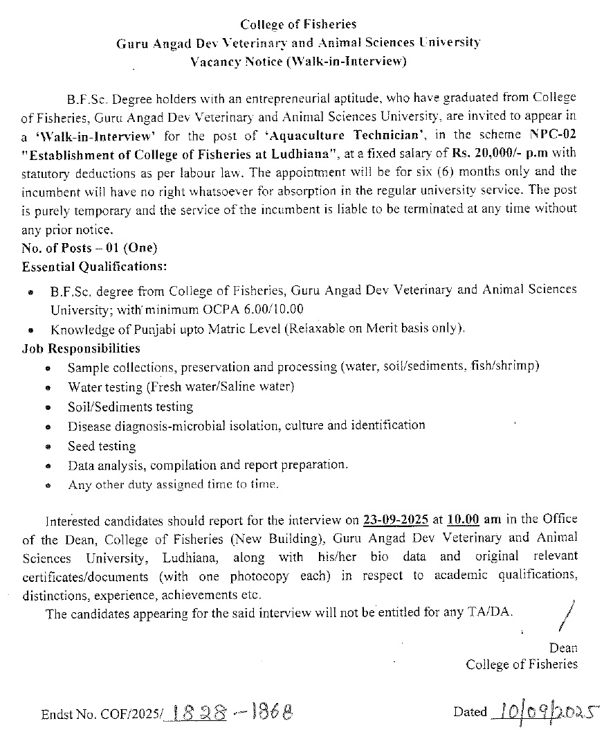 Vacancy notice Walk in Interview for the post of Aquaculture Technician, Dean, College of Fisheries, Guru Angad Dev Veterinary and Animal Sciences University, Ludhiana