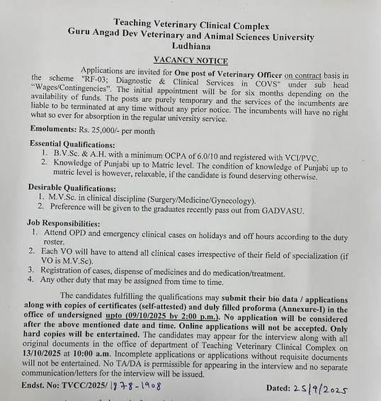 Vacancy notice for the one post of Veterinary Officer on contract basis, Director of Clinics, Dept. of Teaching Veterinary Clinical Complex, Guru Angad Dev Veterinary & Animal Sciences University, Ldh