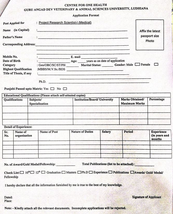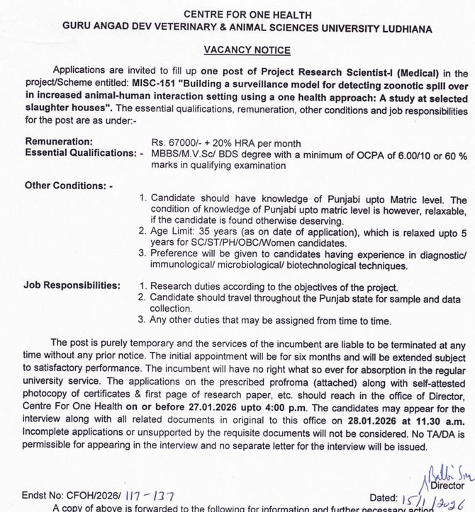 Vacancy Notice for the one post Project Research Scientist-I (Medical), Centre For One Health, Guru Angad Dev Veterinary & Animal Sciences University, Ludhiana