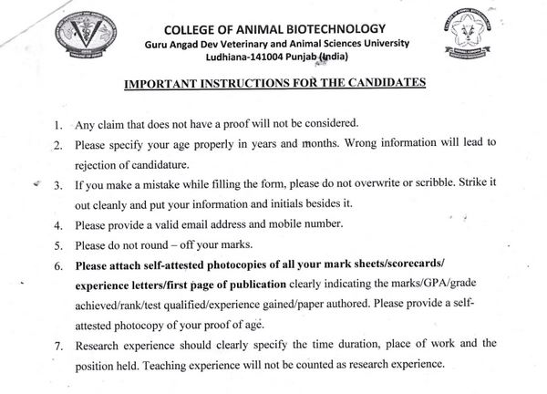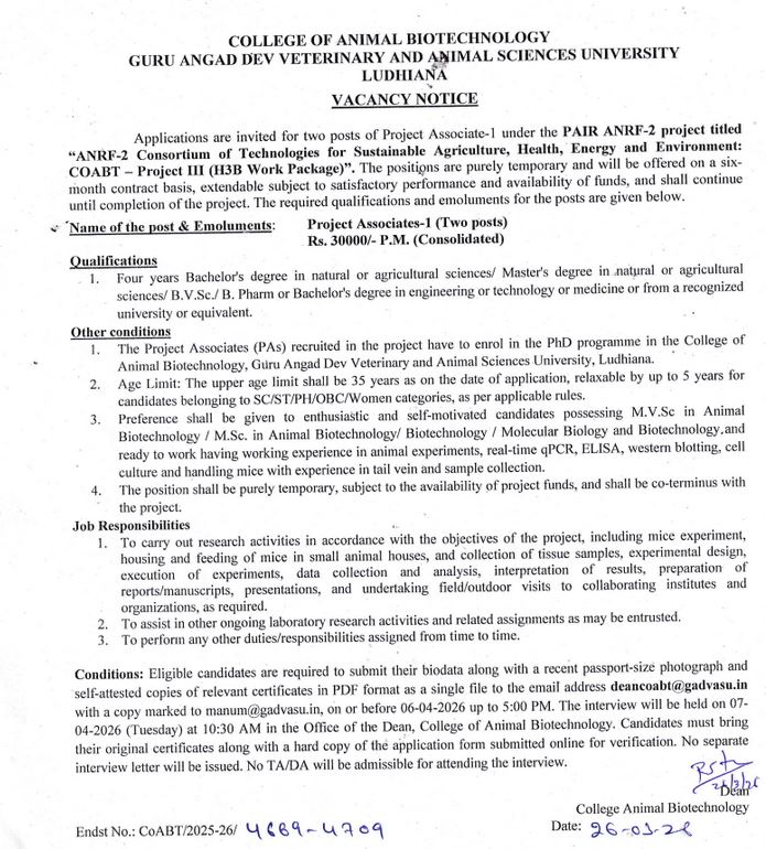 Vacancy Notice (Project Associate-I under ANRF-2), Dean, College of Animal Biotechnology, Guru Angad Dev Veterinary & Animal Sciences University, Ludhiana