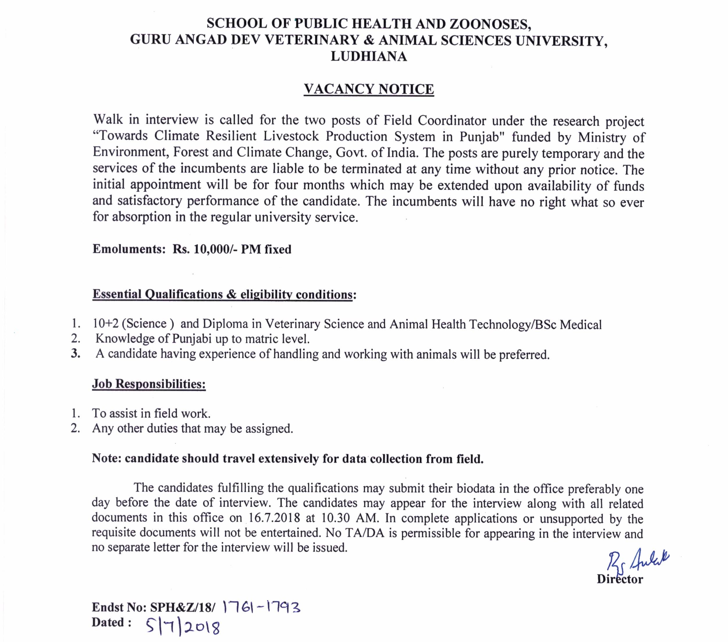 Vacancy Notice for the two posts of Field Coordinator, School of Public Health & Zoonoses, GADVASU, Ludhiana