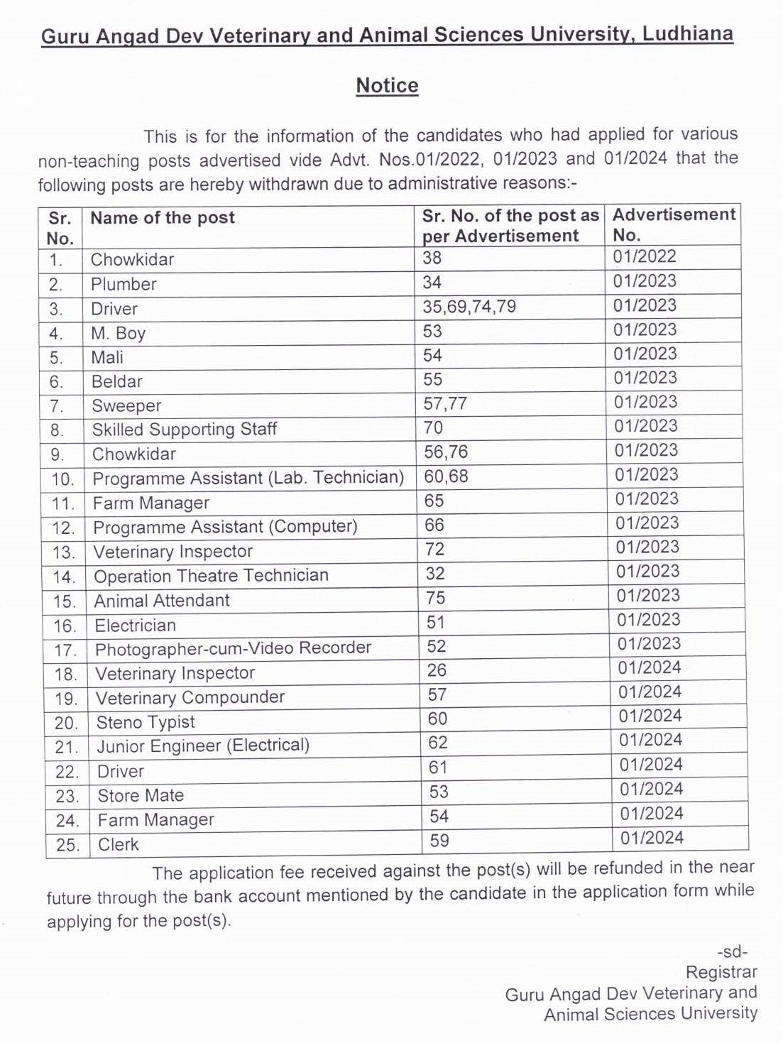 Notice regarding withdrawal of non-teaching posts advertised vide Advt. Nos. 01/2022, 01/2023 and 01/2024