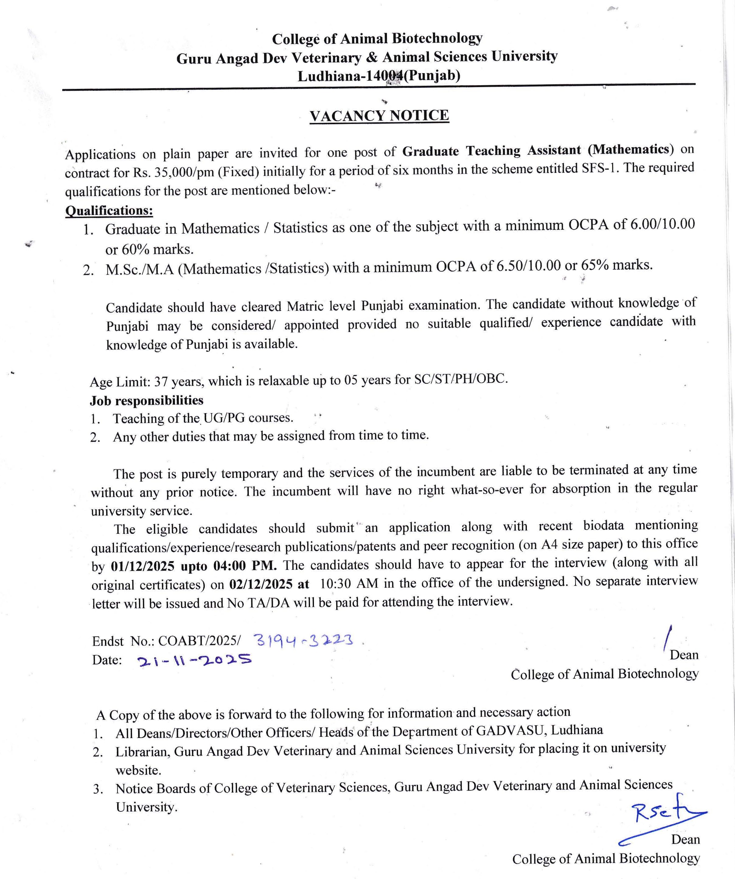 Vacancy Notice for one post of Teaching Assistant (Mathematics) on contract, Dean, College of Animal Biotechnology, Guru Angad Dev Veterinary & Animal Sciences University, Ludhiana