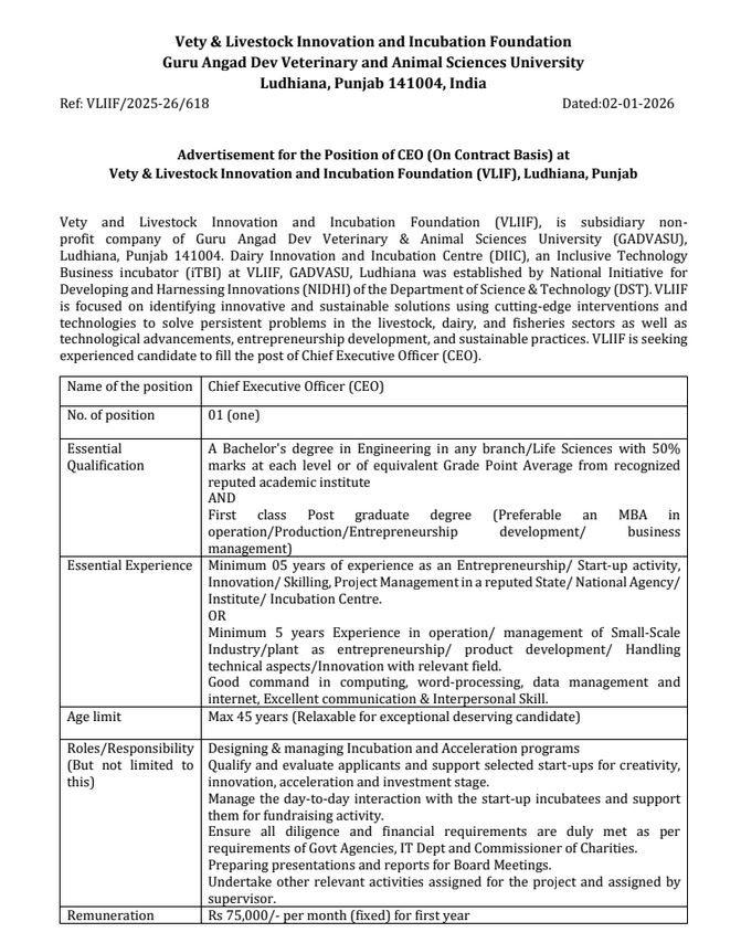 Advertisement for the Position of CEO (On Contract Basis) at Vety & Livestock Innovation and Incubation Foundation (VLIF), Ludhiana, Punjab