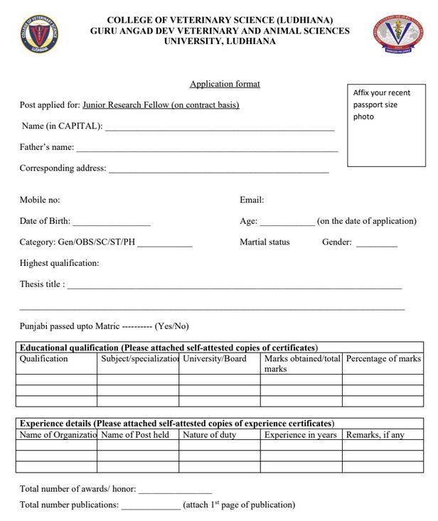 Vacancy Notice for the post of one Junior Research Fellow (on Contract Basis) under the PAIR ANRF Project, Department of Veterinary Anatomy, COVS, GADVASU, Ludhiana