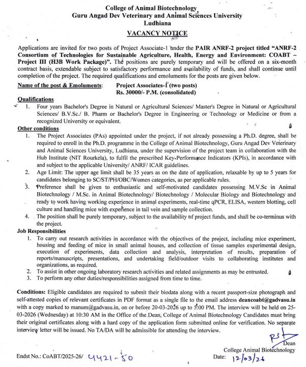 Vacancy Notice of Project Associate 1 under ANRF-2 Project, Dean, College of Animal Biotechnology, Guru Angad Dev Veterinary & Animal Sciences University, Ludhiana