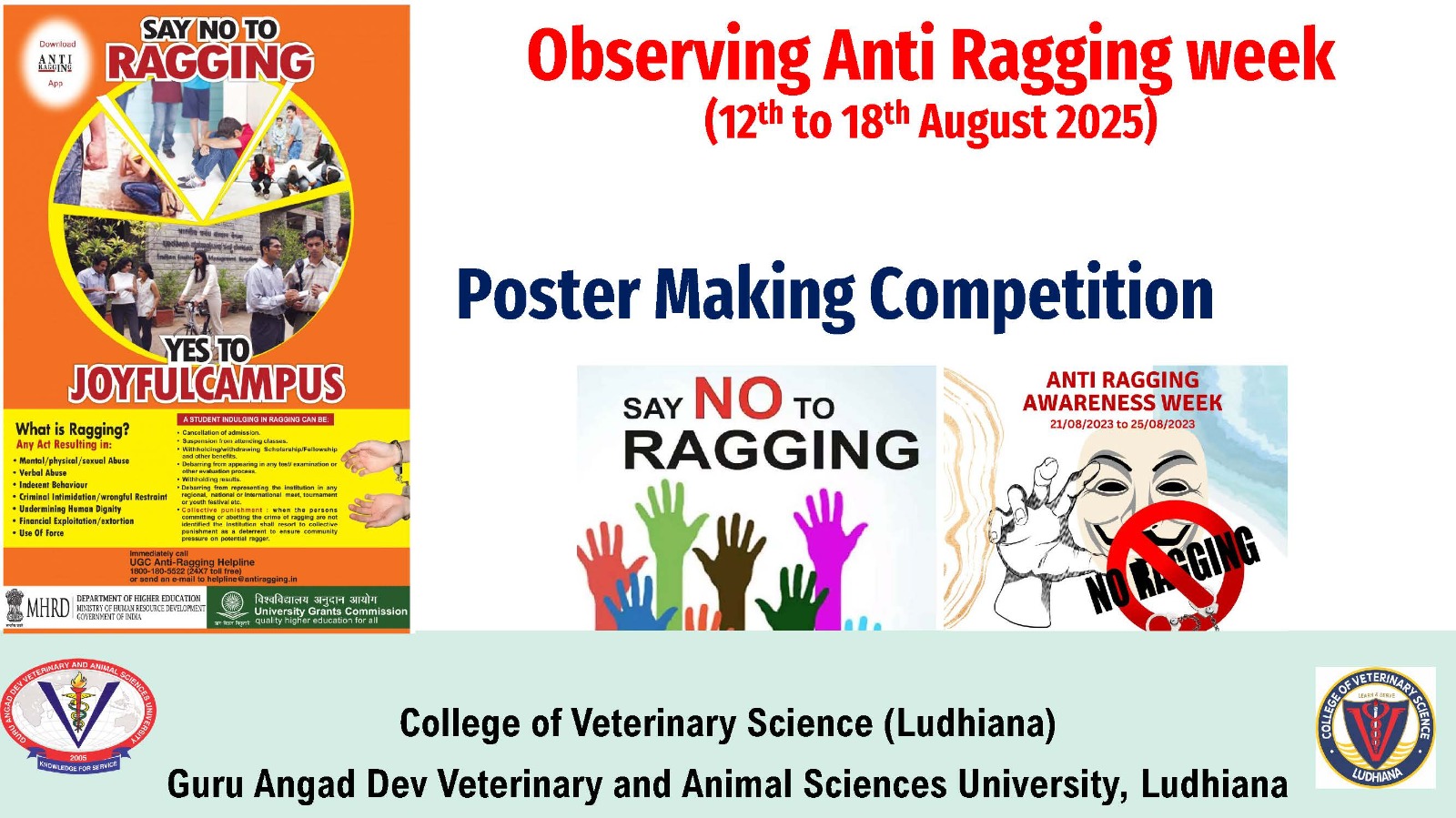 In a spirited effort to promote a safe and inclusive campus environment, the College of Veterinary Science, Guru Angad Dev Veterinary and Animal Sciences University, Ludhiana celebrated Anti-Ragging Week by organizing various events. A Declamation and Extempore event along with an Inter-Class Poster Making Competition was arranged. It was organized by the Literary forum and Fine Arts Club of the college. Dr. Swaran Singh Randhawa, Dean said that the events aimed to raise awareness about the harmful effects of ragging and to encourage students to stand united against any form of harassment.