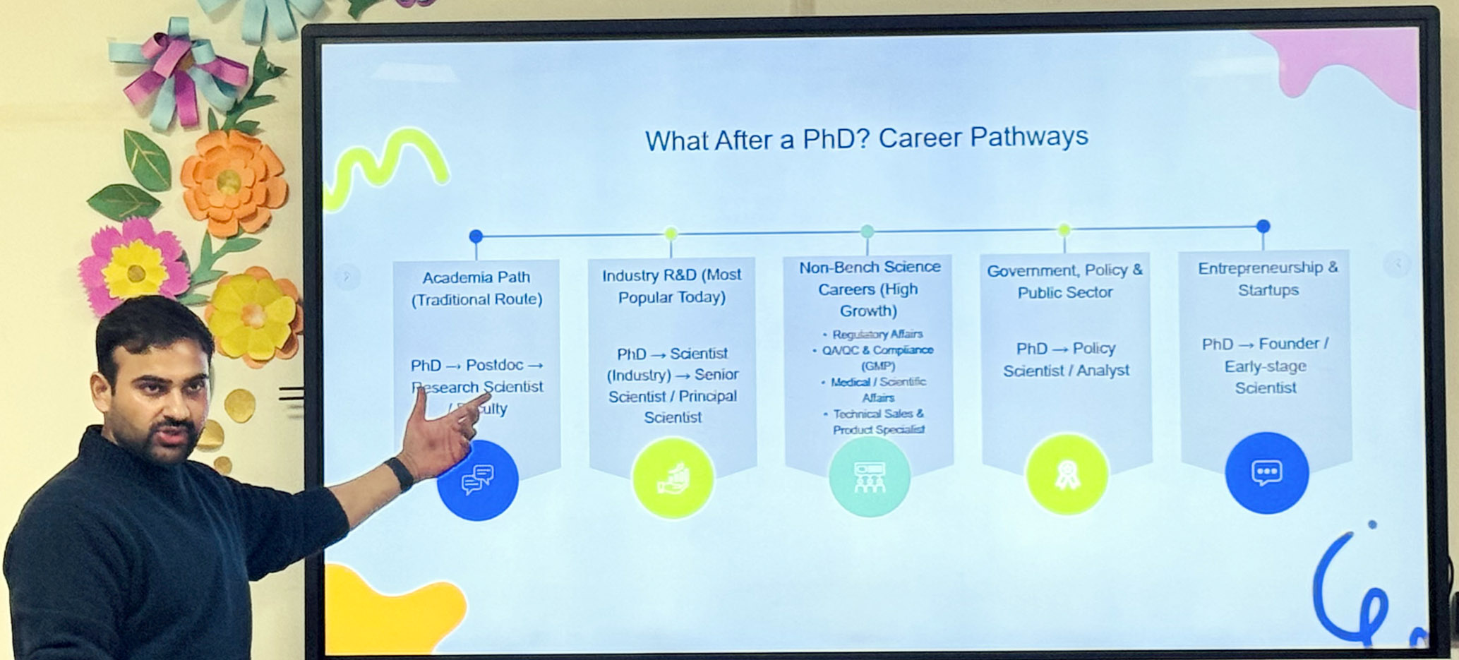 An interactive session with faculty and students, addressed practical queries related to PhD admissions, postdoctoral positions, funding opportunities, and overseas industry recruitment.