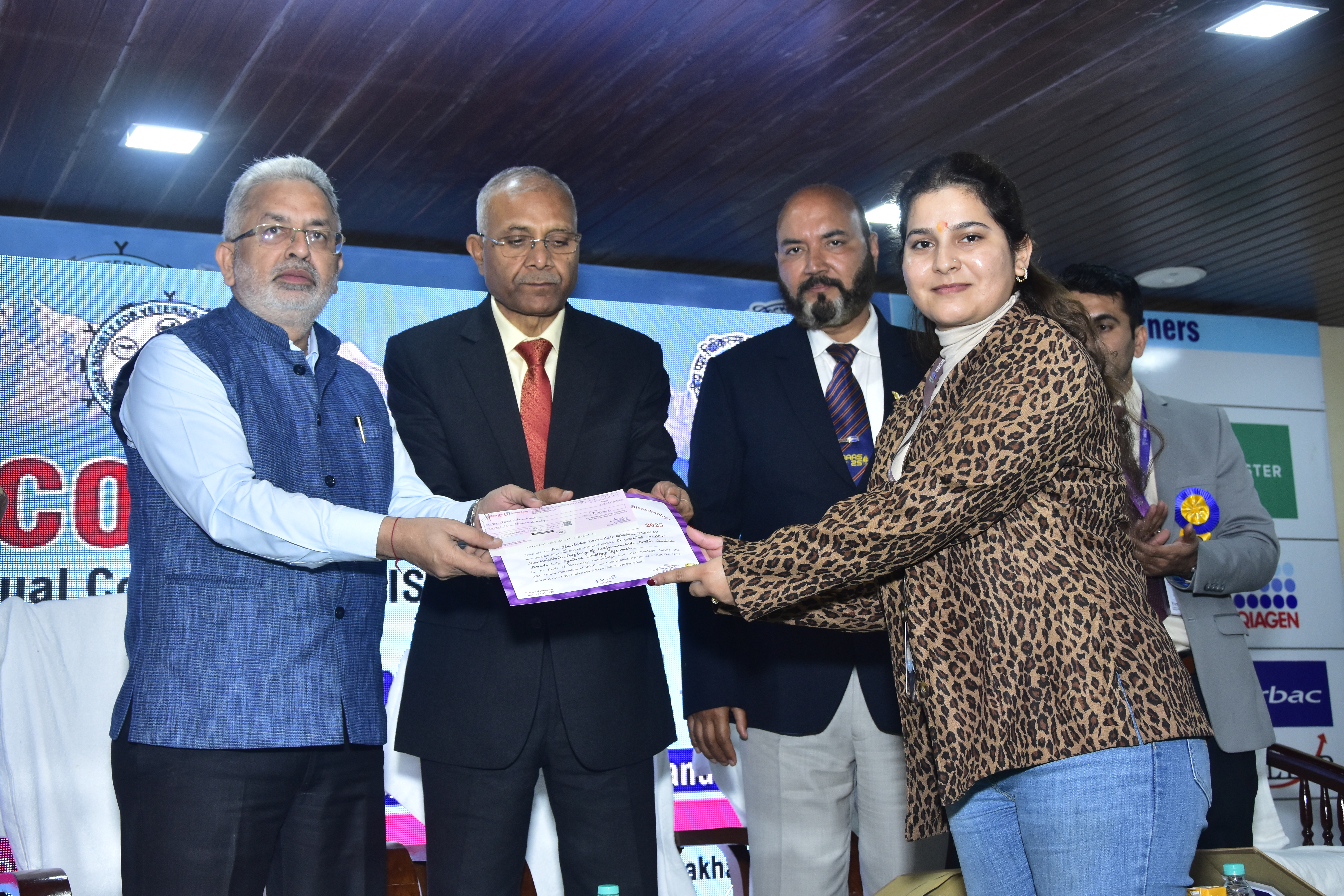 Doctoral scholar Jaswinder Kaur, guided by Dr. C. S. Mukhopadhyay, won the ISVIB-Young Scientist Award with a cash prize of Rs. 5,000 for her research on transcriptomic differences in indigenous versus exotic dogs. Another doctoral student, Aakriti Pathania secured the Third Prize in Oral Presentation in the “Frontiers in Translational Biotechnology” session.