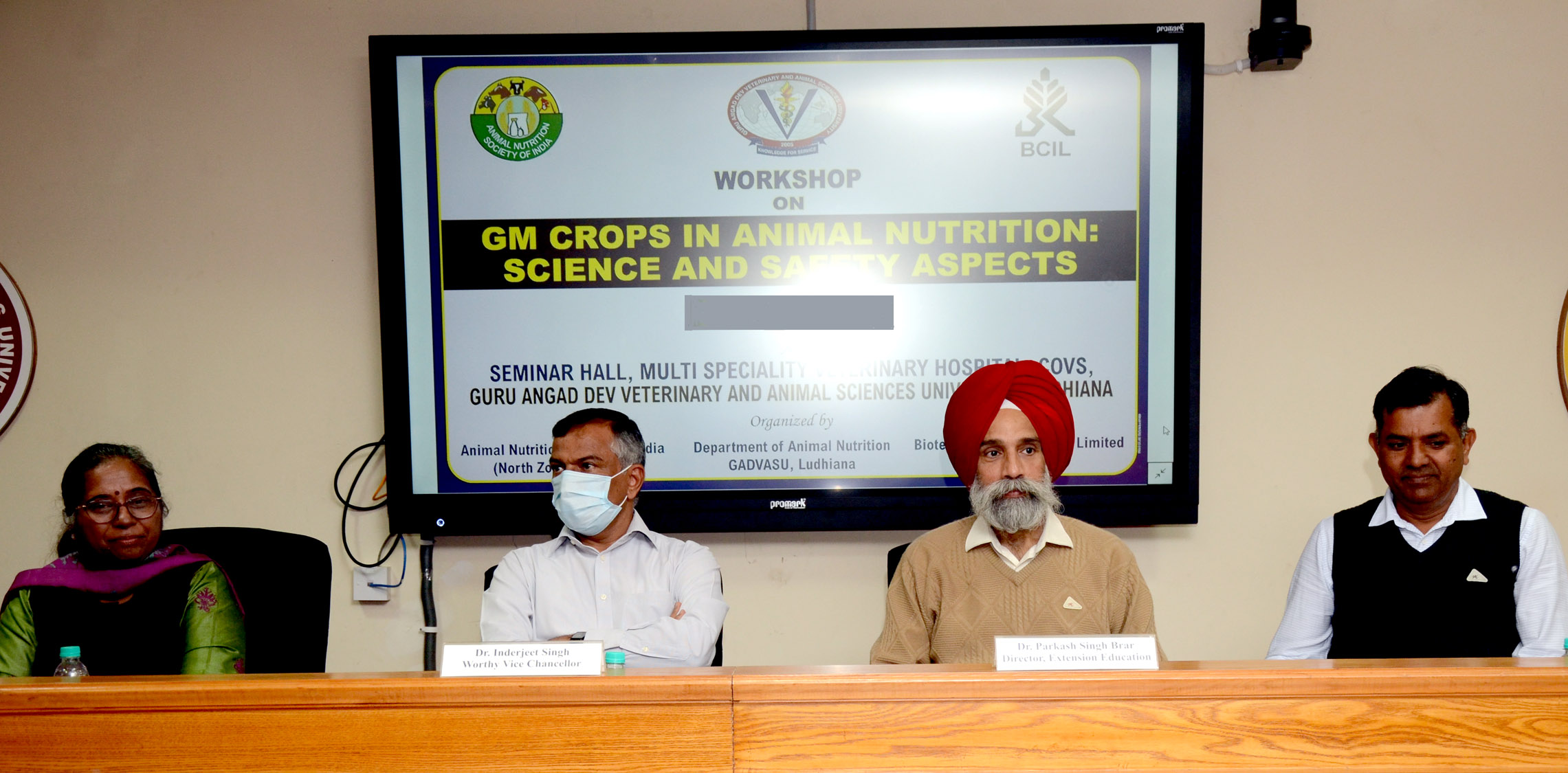 with Animal Nutrition Society of India (ANSI) and Biotech Consortium India Limited (BCIL), New Delhi conducted a workshop on 'Genetically Modified (GM) crops in animal nutrition: science and safety aspects'. The workshop was attended by more than 100 participants from faculty of different veterinary universities, KVKs, dairy & poultry feed millers and farmers. Dr Udeybir Chahal, President ANSI welcomed the guests and highlighted the importance of genetically modified (GM) crops. Dr Vibha Ahuja, Chief General Manager of BCIL in her keynote address revealed safety and regulatory aspects of GM crops as animal feed.