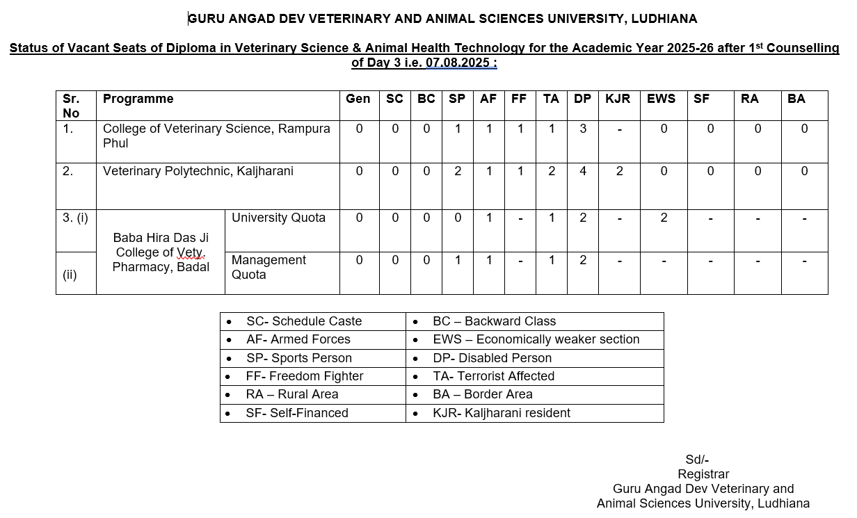 Status of vacant seats of Diploma in Veterinary Science & Animal Health Technology for the academic year 2025-26 after 3rd day of 1st counselling