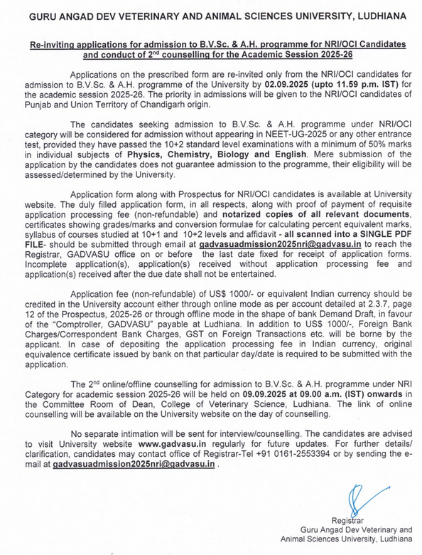 Notice regarding re-inviting applications for admission to B.V.Sc. & A.H. porogramme for NRI/OCI candidates and conduct of 2nd counselling for the year 2025-26