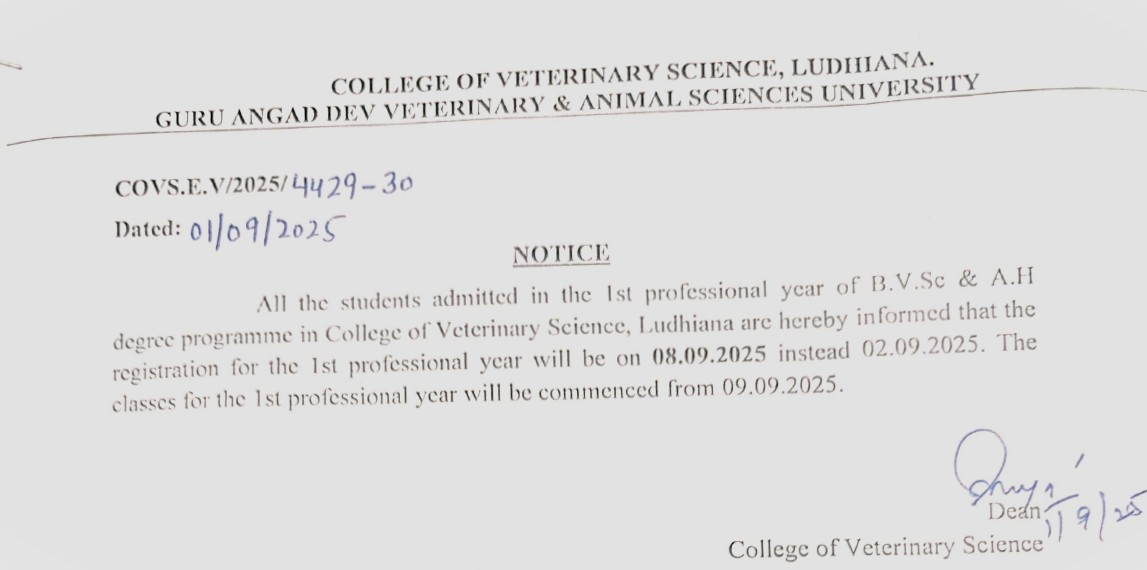 Notice Regarding Registration on 1st Professional year B.V.Sc. & A.H.(Batch 2025) for COVS, Ludhiana