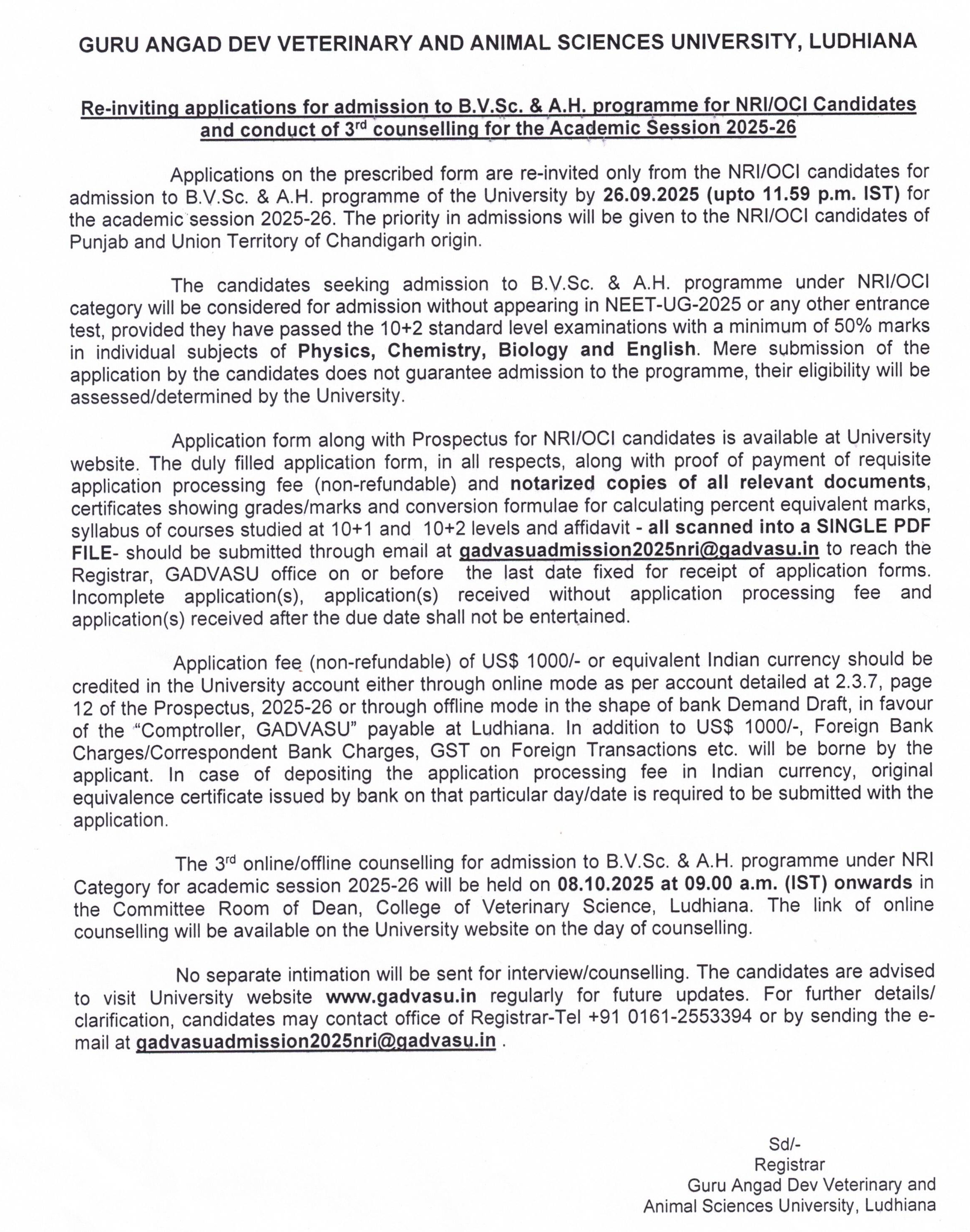Notice for re-inviting applications for admission to B.V.Sc. & A.H. programme for NRI/OCI candidates and conduct of 3rd counselling for the year 2025-26