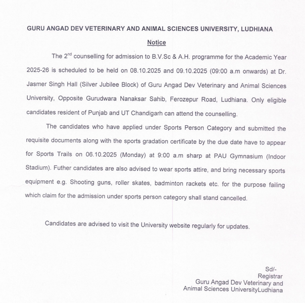 Notice for 2nd counselling for admission to B.V.Sc. & A.H. programme for the Academic Year 2025-26
