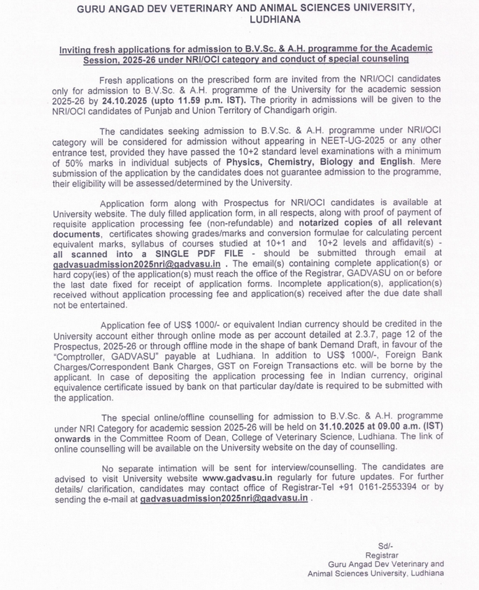 Notice regarding inviting fresh applications for admission to B.V.Sc. & A.H. programme for the year 2025-26 under NRI/OCI category and conduct of special counselling