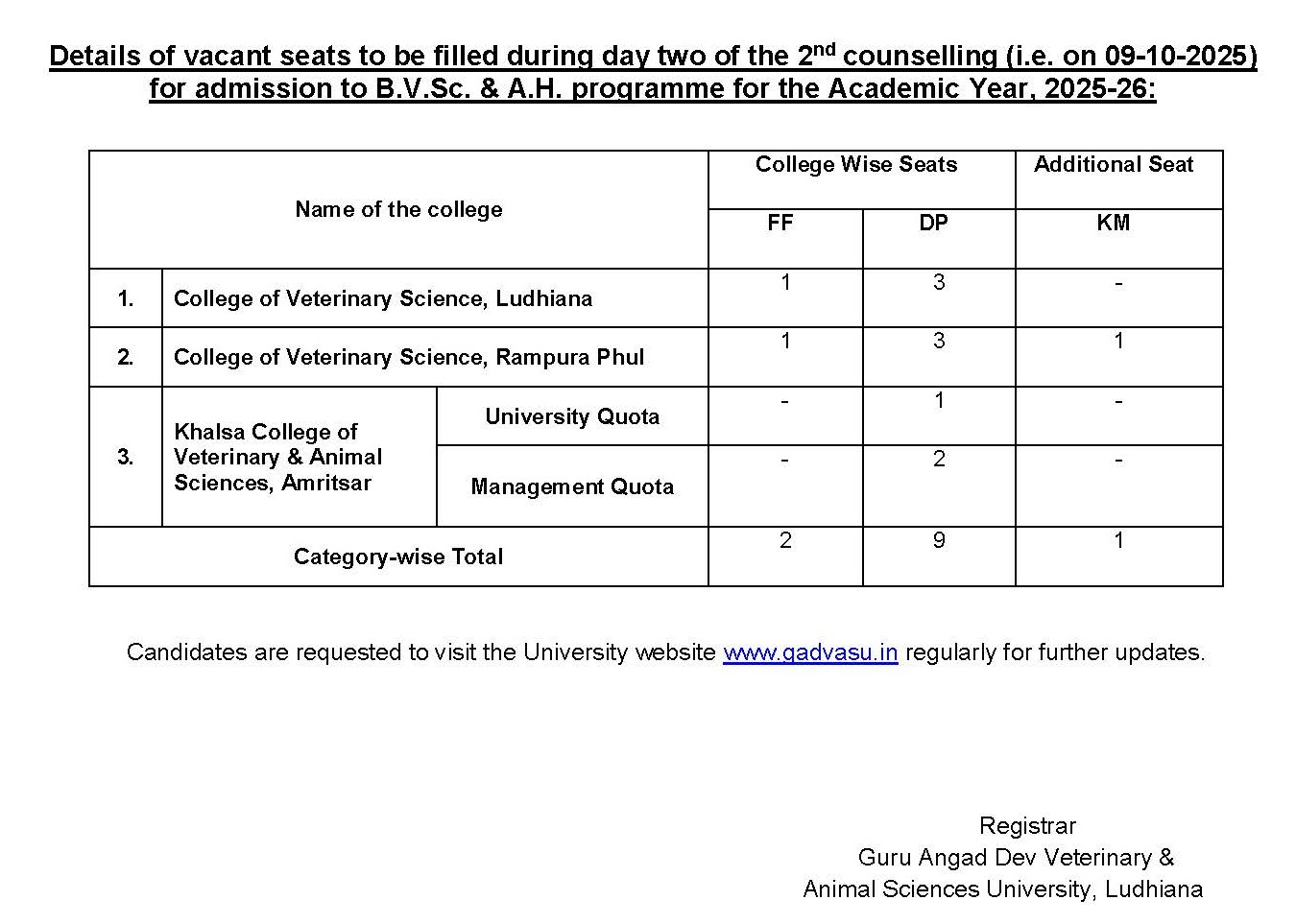 Details of vacant seats to be filled during day two of the 2nd counselling (09-10-2025) for admission to B.V.Sc. & A.H. Programme for academic session 2025-26