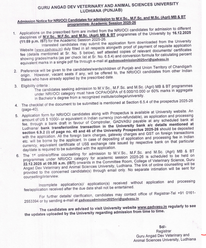 Notice for NRI/OCI candidates for admission to M.V.Sc., M.F.Sc. and M.Sc. (Agri) MB & BT programmes - Academic Session 2025-26