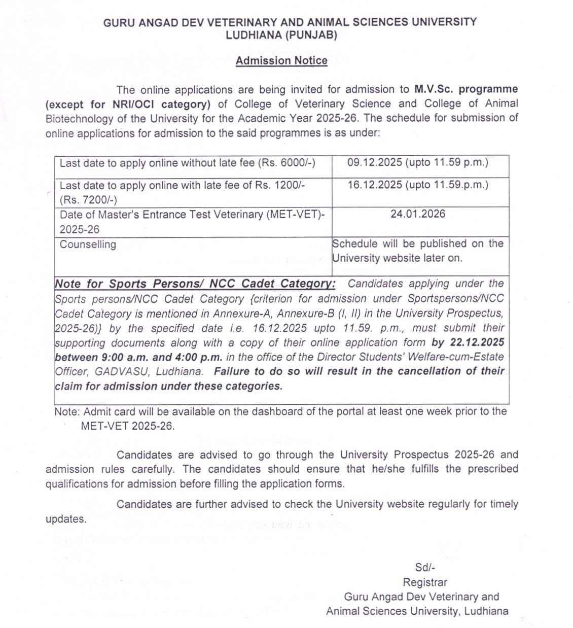 Notice regarding Admission to M.V.Sc. Programme (except for NRI/OCI category) for the Academic Year 2025-26