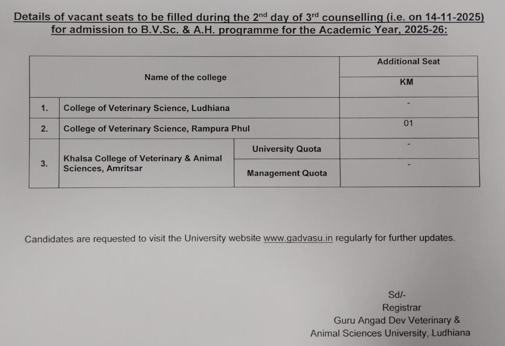 Details of vacant seats to be filled during 2nd day of 3rd counselling (i.e. 14-11-2025) for admission to B.V.Sc. & A.H. Programme for Academic Year 2025-26
