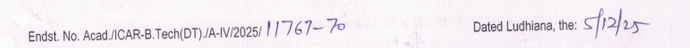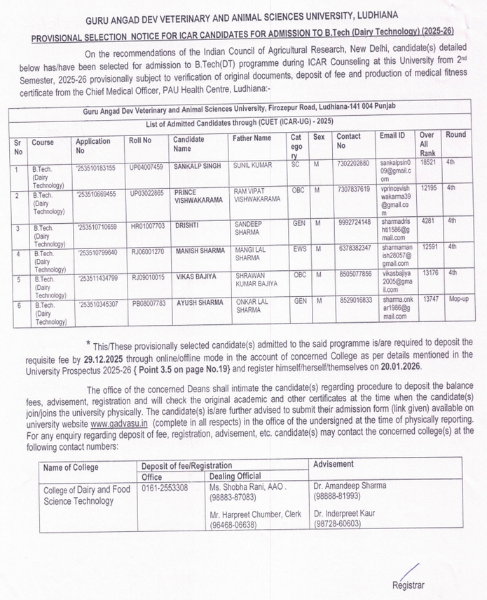 Provisional selection notice of ICAR candidates for admission to B.Tech (Dairy Technology) for the Academic Year 2025-26