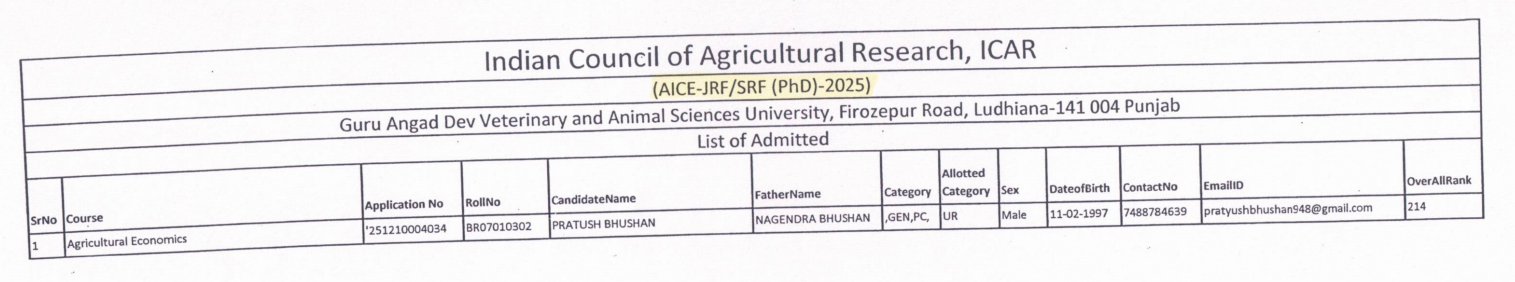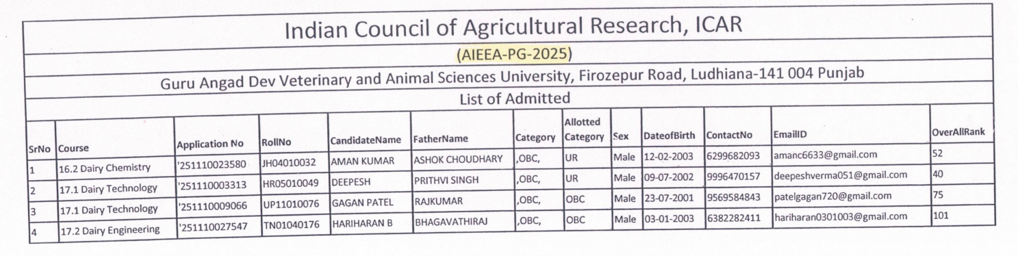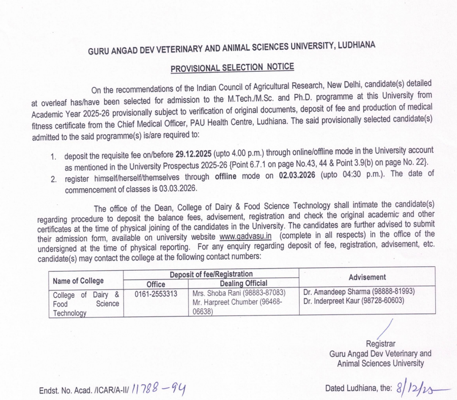 Provisional selection notice of ICAR candidates for admission to M.Tech./M.Sc. and Ph.D. programme for the Academic Year 2025-26