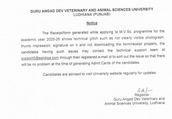 Notice regarding technical glitch while applying to M.V.Sc. programme