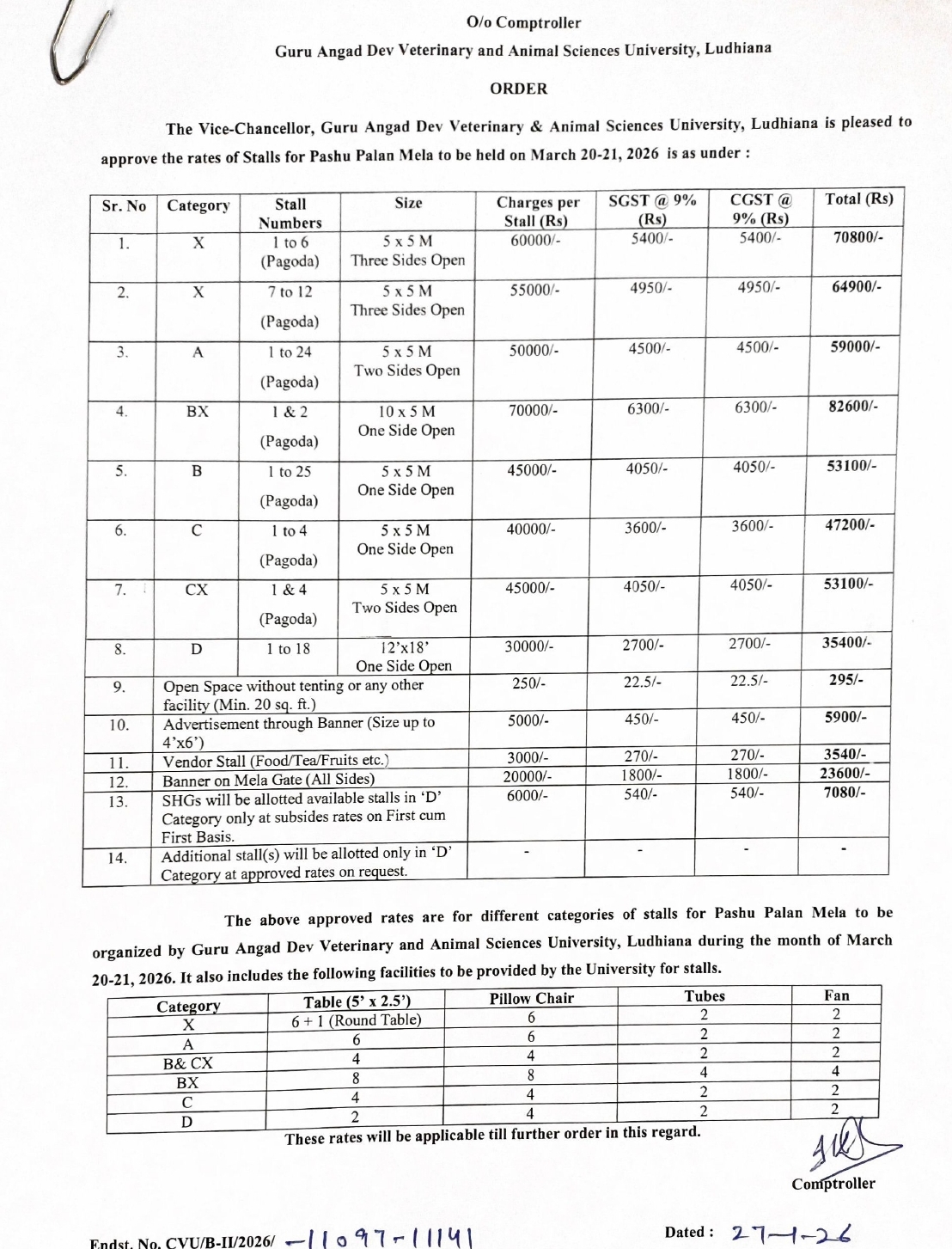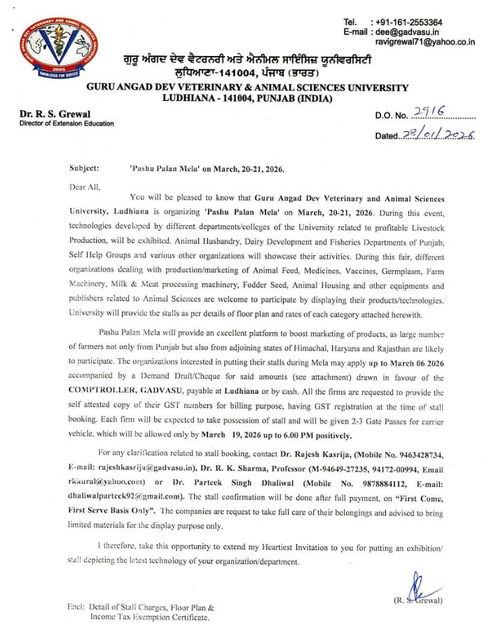 Booking of stall for Pashu Palan Mela of Guru Angad Dev Veterinary & Animal Sciences University, Ludhiana on March 20-21, 2026