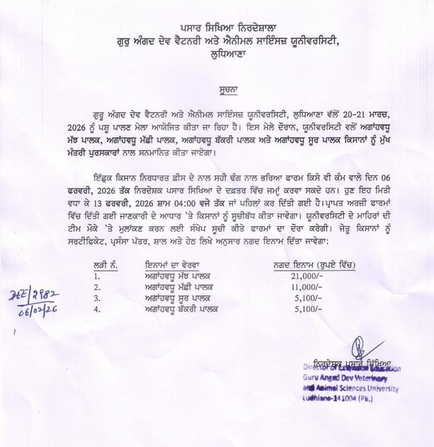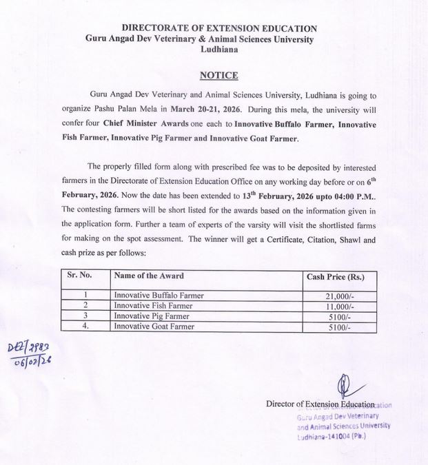 Extension in date for applying for CM Award for Innovative Buffalo Farmer, Innovative Fish Farmer, Innovative Goat Farmer, Innovative Pig Farmer
