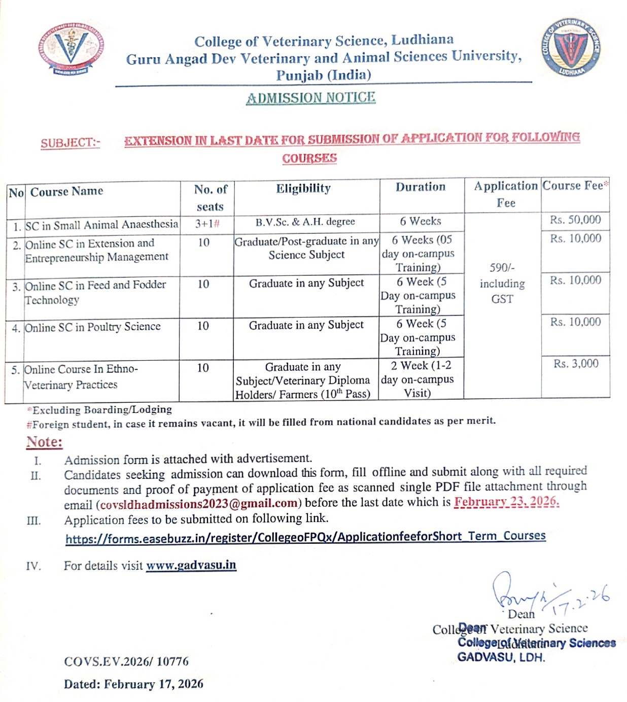 Extension of Last Date for Submission of Applications for Short Courses/Online Short Courses, College of Veterinary Science, Guru Angad Dev Veterinary & Animal Sciences University, Ludhiana