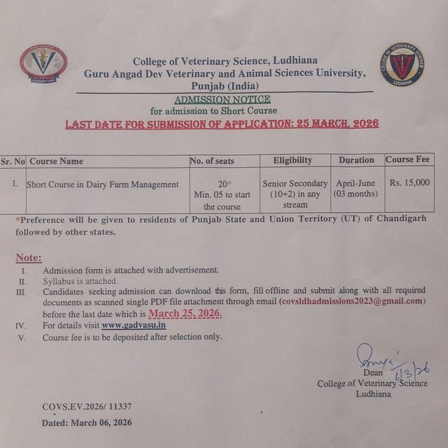 Admission Notice for Short Courses/Online Short Courses, College of Veterinary Science, Guru Angad Dev Veterinary & Animal Sciences University, Ludhiana