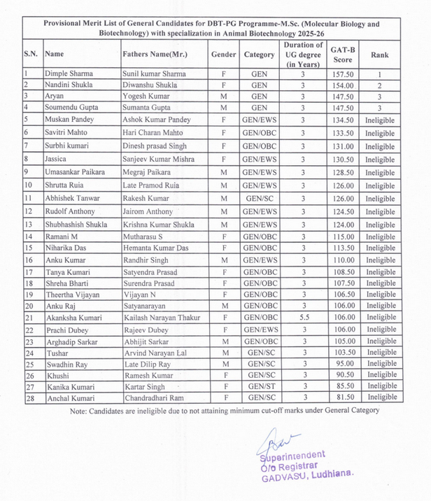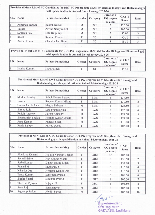 Provisonal Merit list for admission to DBT-PG Programme - M.Sc. (Molecular Biology & Biotechnology) with specialization in Animal Biotechnology for Academic Year 2025-26