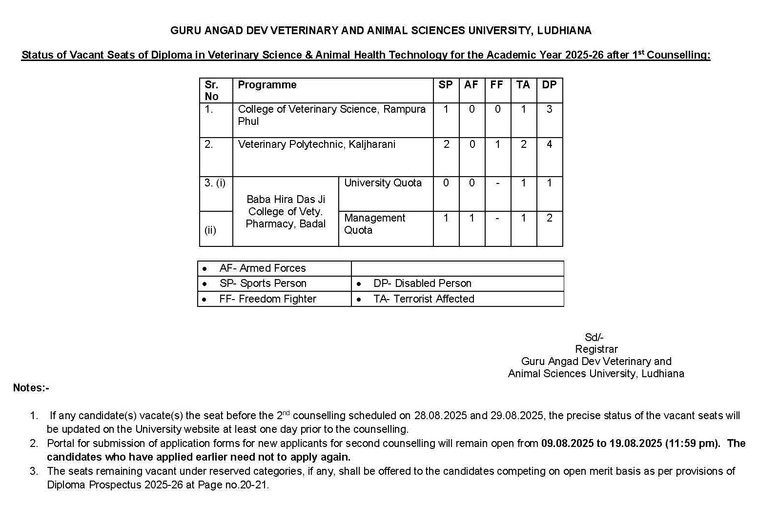 Status of Vacant Seats of Diploma in Veterinary Science and Animal Health Technology for the academic year 2025-26 after 1st counselling