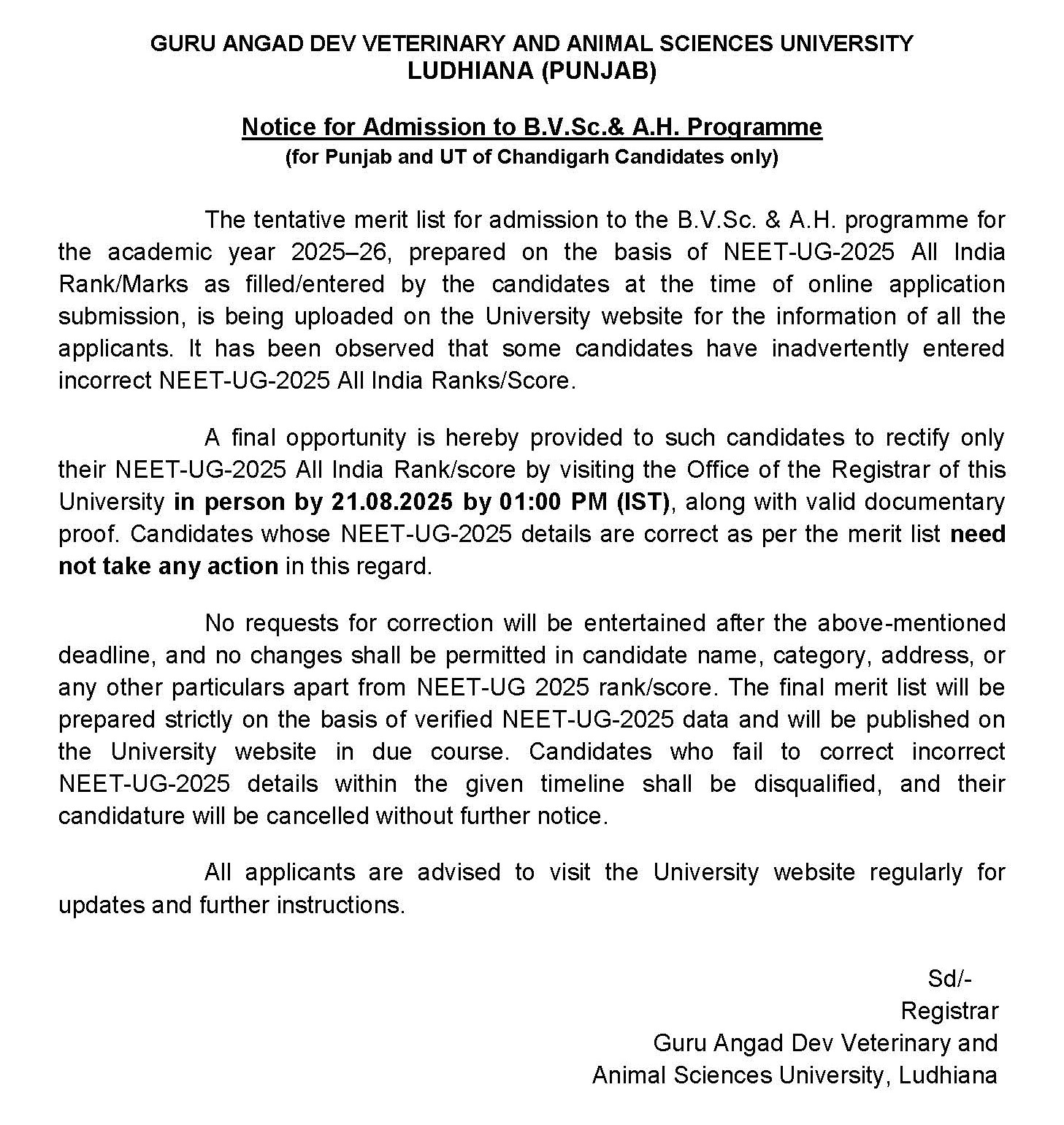 Notice for tentative merit list for Admission to B.V.Sc.& A.H. Programme for academic year 2025-26