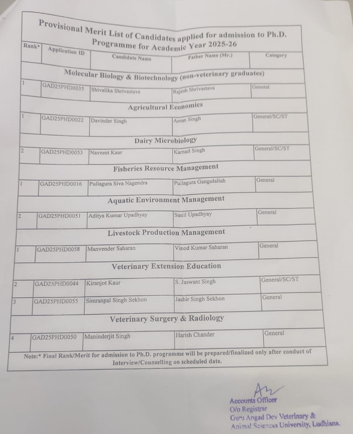Provisional Merit List of Candidates applied for admission to Ph.D. Programme for Academic Year 2025-26