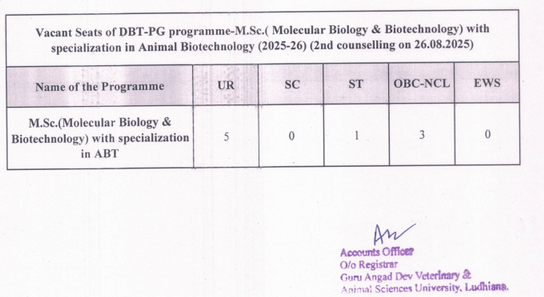 Status of Vacant seats of DBT-PG programme-M.Sc. (Molecular Biology & Biotechnology) with specialization in ABT (Academic Year 2025-26) for 2nd counselling