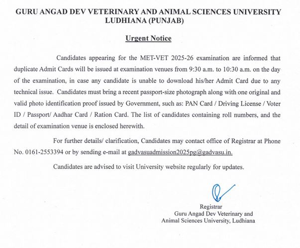 Urgent Notice regarding candidates appearing for the Met-Vet 2025-26 examination