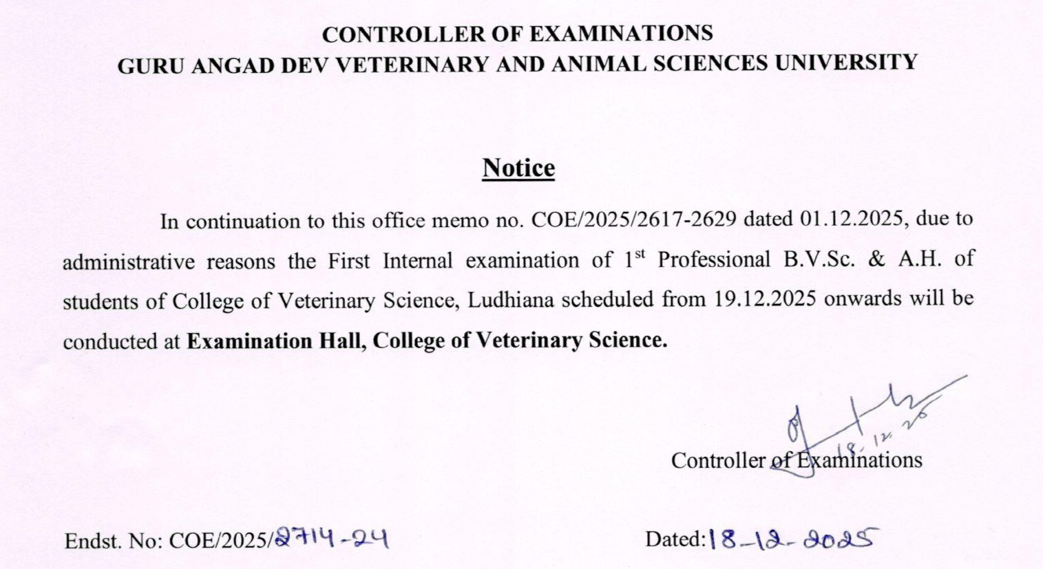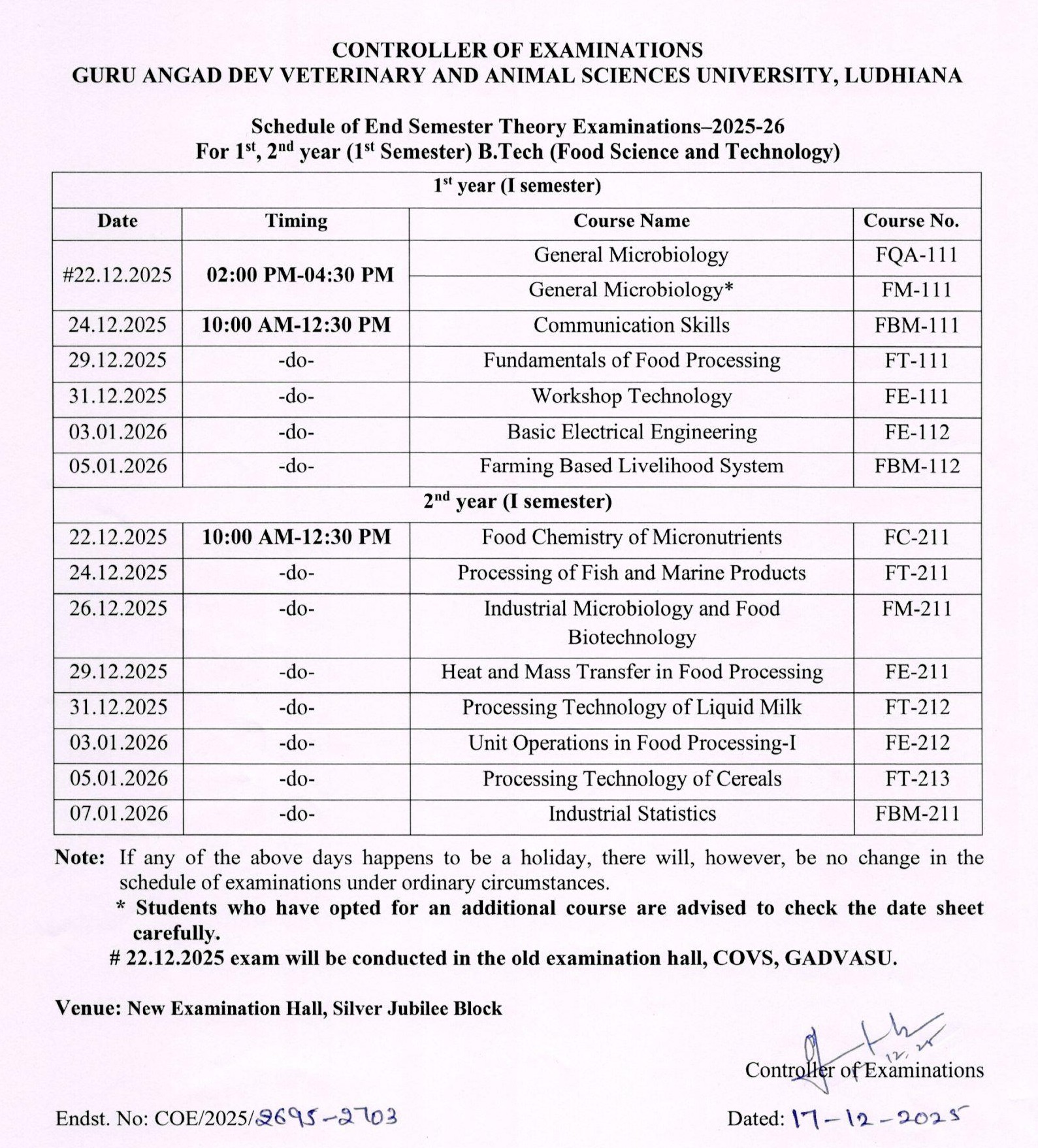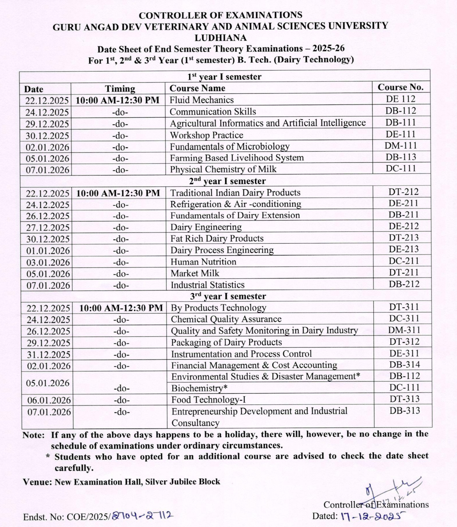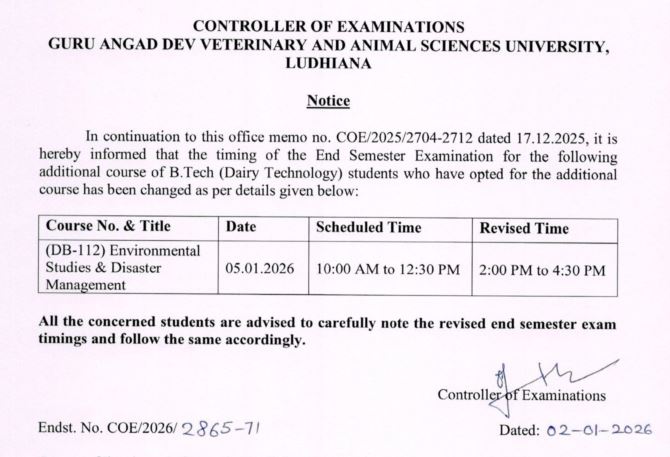 Notice in continuation to this office memo no. COE/2025/2704-2712 dated 17.12.2025 regarding timing of End Semester Examination for B.Tech (Dairy Technology) students. |
