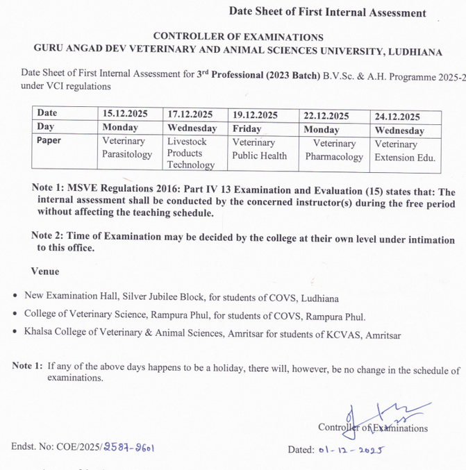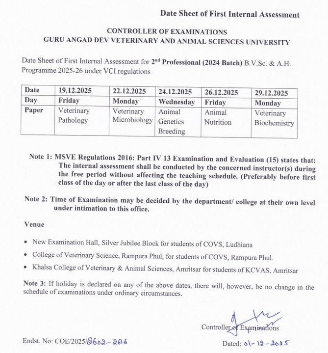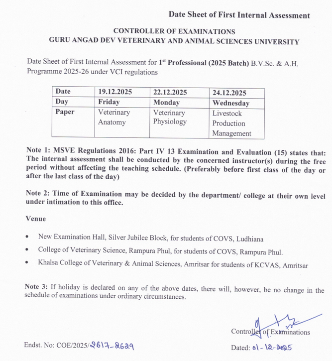 Date Sheet of First Internal Assessment for 1st Professional (2021 Batch) B.V.Sc. & A.H. Programme 2021-22 under VCI regulations | Click here to view |