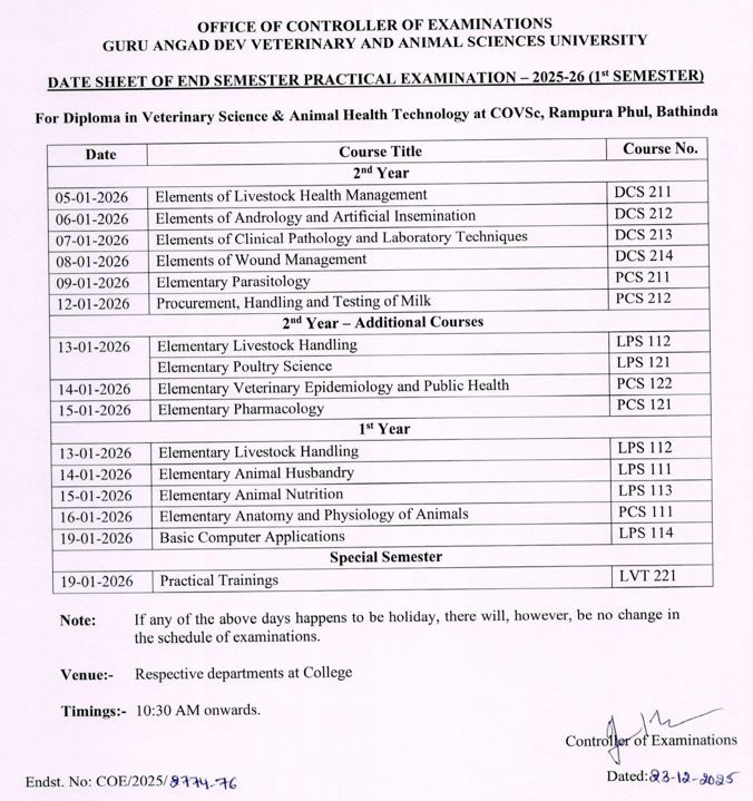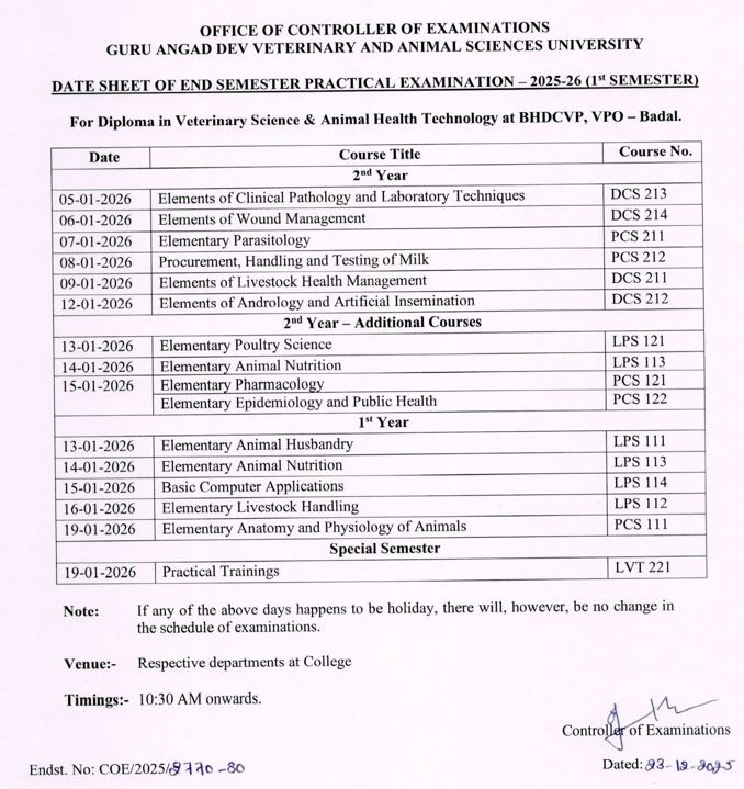 Date Sheet of End Semester Practical Examination -2023-24(1st Semester) For Diploma in Veterinary Science & Animal Health Technology at COVSc, Rampura Phul, Bathinda) |