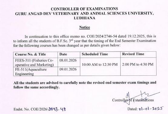 Notice in continuation to this office memo no. COE/2024/2746-54 dated 19.12.2025, this is to inform all the students of B.F.Sc. 3rd year that the timing of End Semester Examination for mentioned courses has been changed. |