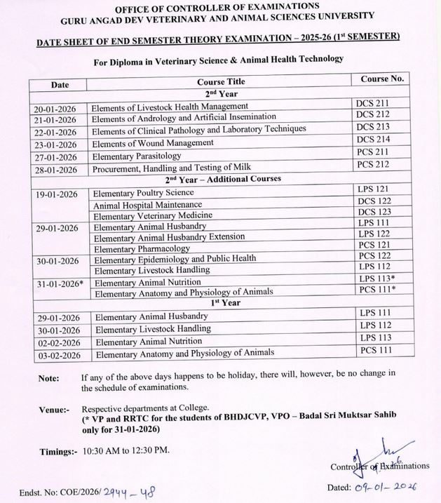 Date Sheet of End Semester Theory Examination 2021-22 (2nd Semester) for Diploma in Veterinary Science & Animal Health Technology | Click here to view |