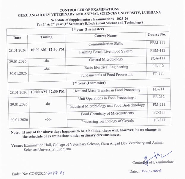Schedule of Supplementary Examinations - 2025-26 For 1st & 2nd year (1st Semester) B.Tech.(Food Science and Technology) |