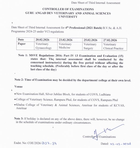 Date Sheet of Second Internal Assessment for 2nd Professional (2020 Batch) B.V.Sc. & A.H. Programme 2021-22 under VCI regulations | Click here to view |
