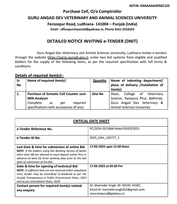 e-Tender Notice for the purchase of Somatic Cell Counter cum Milk Analyzer, Assistant Store Officer, Purchase Cell, O/o Comptroller, GADVASU, Ludhiana