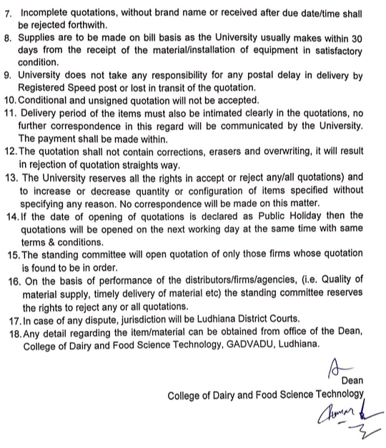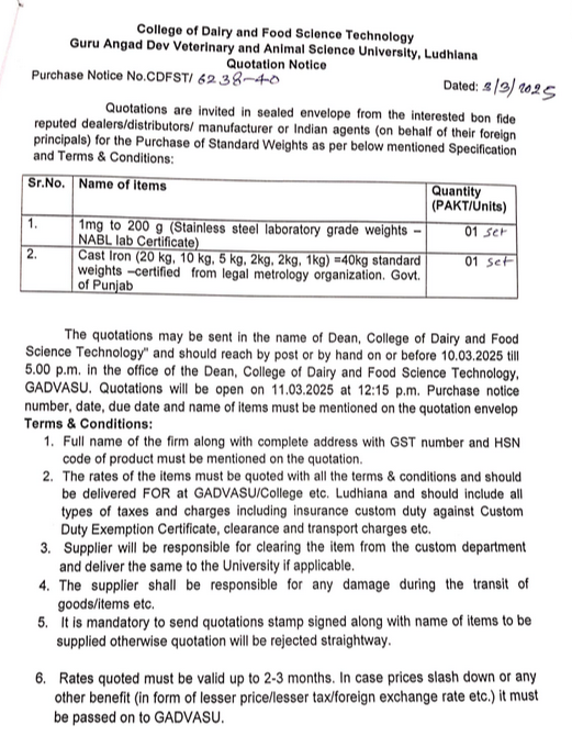 Quotation Notice for the Purchase of Standard Weights, Dean, College of Dairy and Food Science Technology, Guru Angad Dev Veterinary & Animal Sci. Univ., Ludhiana