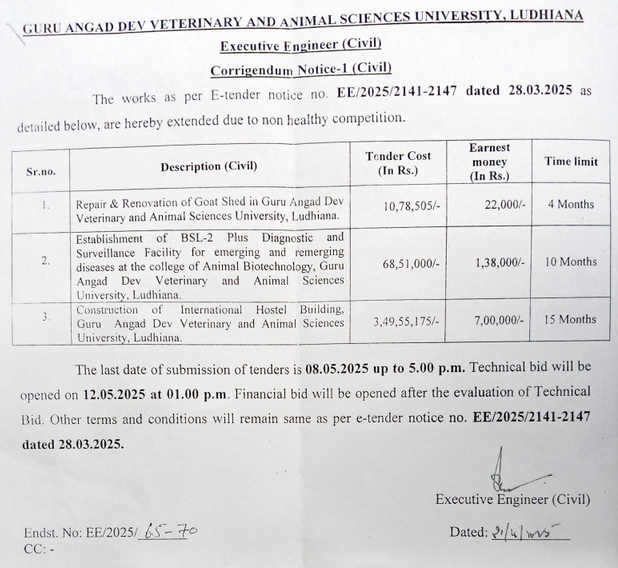 Corrigendum Notice -1 (Civil) for notice no. EE/2025/2141-2147 regarding various Civil works, Executive Engineer (Civil), Guru Angad Dev Veterinary and Animal Sciences University, Ludhiana